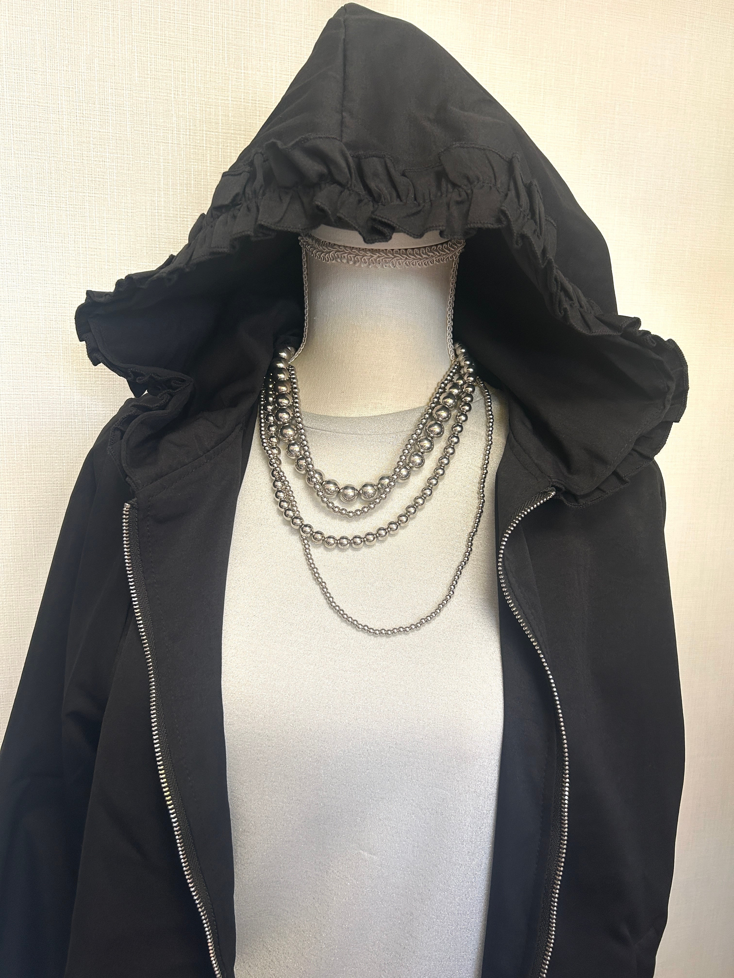 フリルフードジップ&クラッシュデニムスカートは、トレンドのフリルフードとクラッシュデザインが絶妙に組み合わさった、あなたのファッションを引き立てる一着です!デニム素材の柔らかさと耐久性を兼ね備え、日常使いにもぴったりなアイテムです。 インナーのラメ使いのプルオーバーは着回しさも抜群。